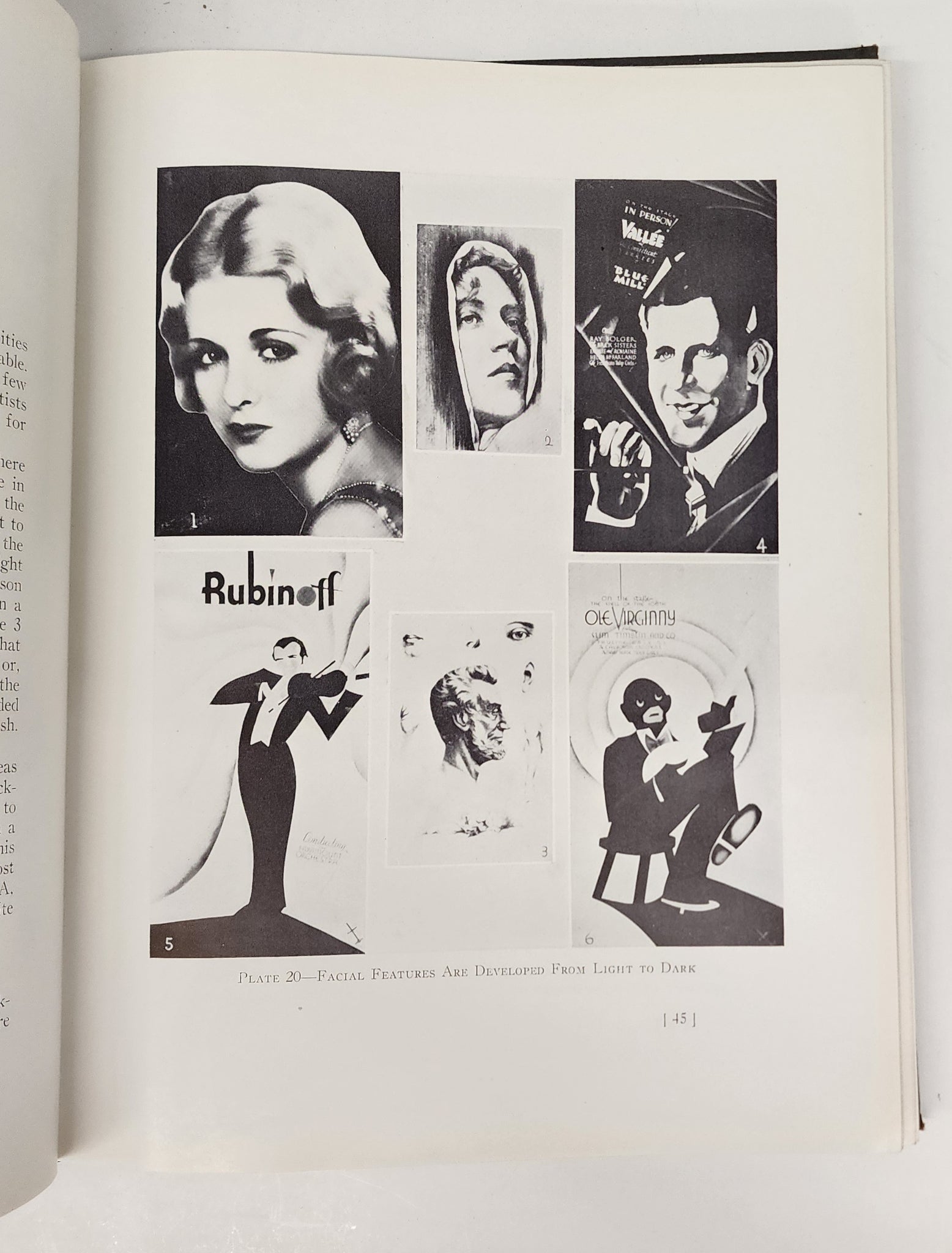 1930s sample artwork. Includes water colour, velour, transparent, pastel, air brush, lithograh, linoleum, "aplakay," silk screen, and pencil sketch posters. Sections on lettering, design, figure drawing, theatrical fronts, animated displays, theatre decoration, costumes, etc.