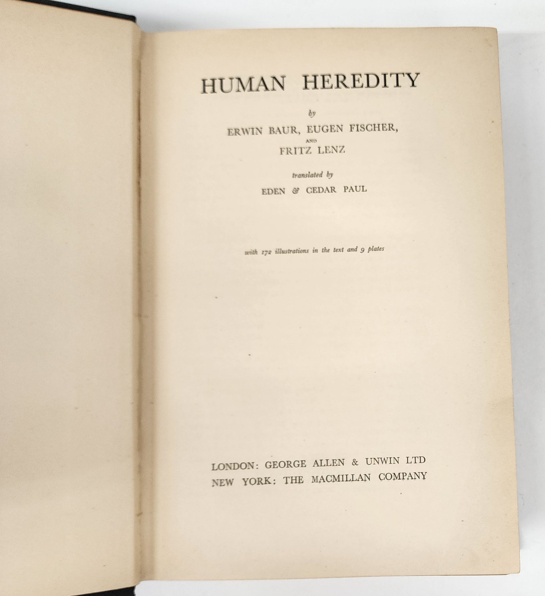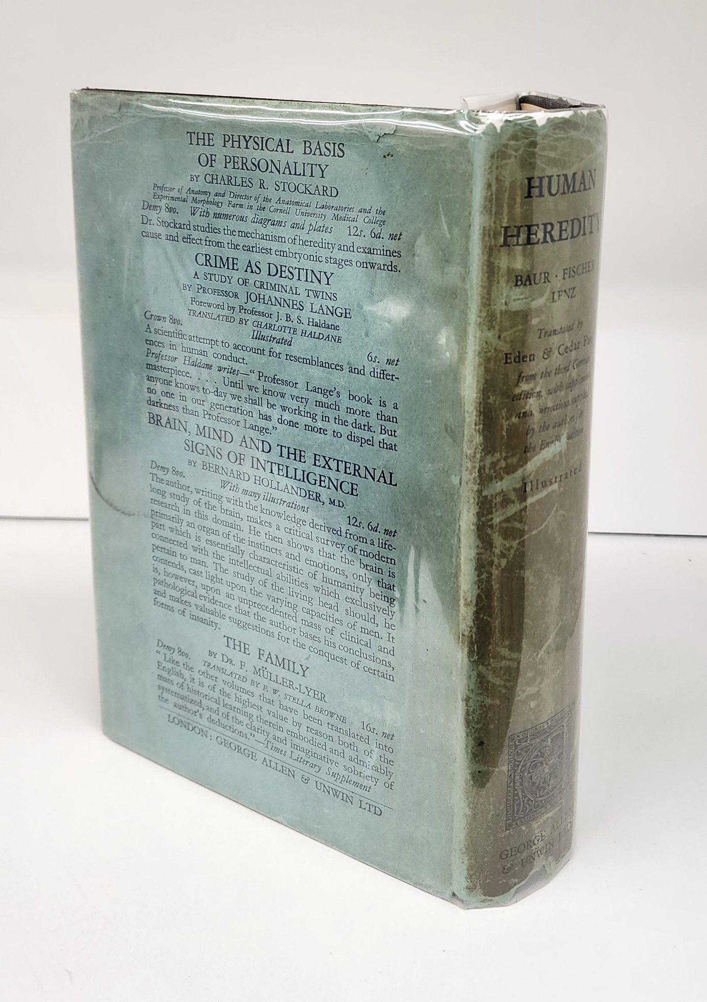 Dr. Benjamin Goldberg's copy of this now-notorious "scientific" analysis of heredity. Goldberg was Chief of Psychiatry at the Child & Parent Resource Institute in London, Ontario, from 1960 to 1965. He made a vow to protect people with disabilities after experiencing victimization during World War II. Arguably, the kind of thinking that produced this book about the racial differences in mankind was what led to those atrocities.
