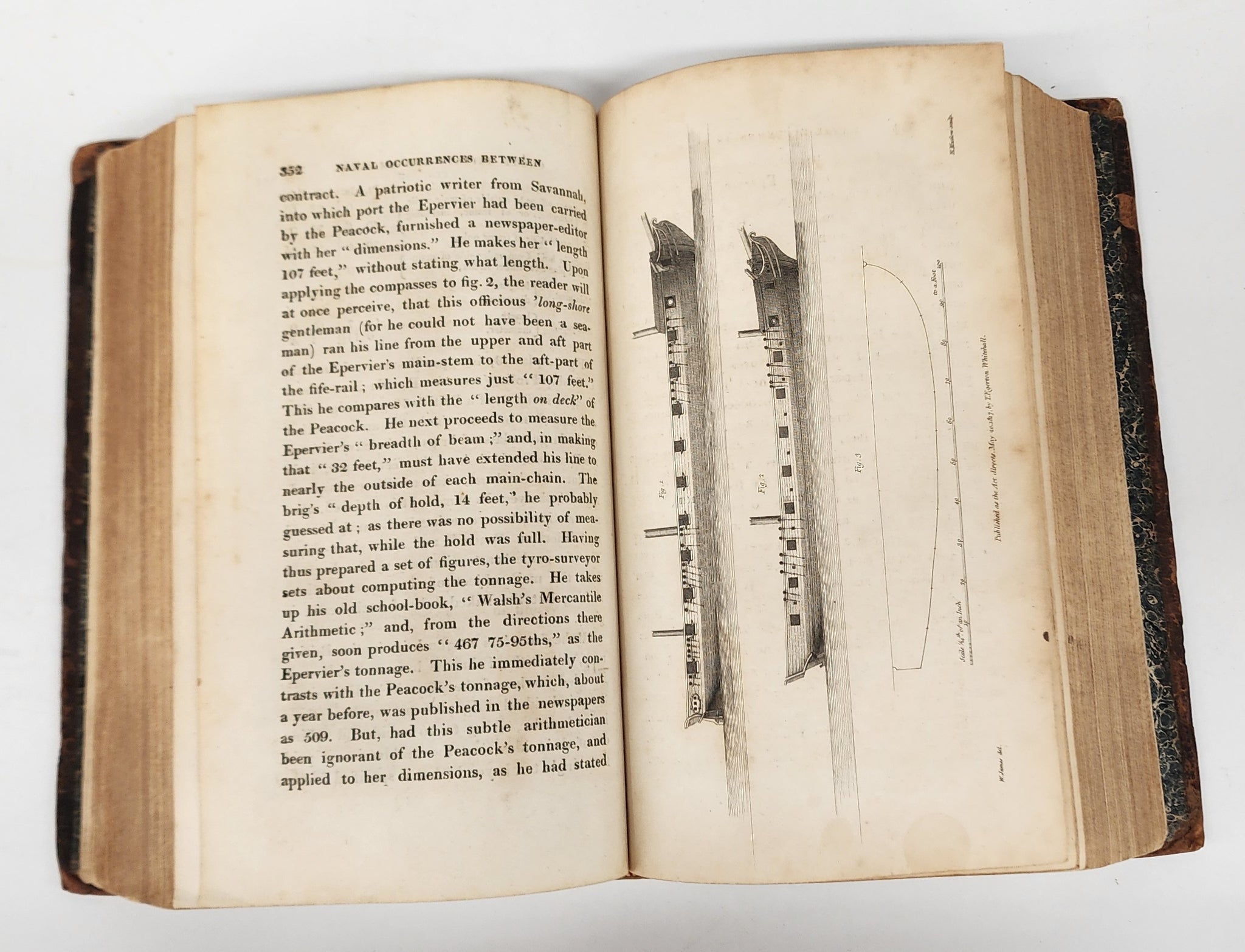 Title continues: "Preceded by a Cursory Examination of the American Accounts of Their Naval Actions Fought Previous to that Period: To which is added An Appendix; With Plates." English lawyer and historian William James wrote this book to counter what he considered the bombastic and false version of the war put forward by American authors. To free the war from the "foulest aspersions" of the Americans, James used his legal mind to pick through a wealth of evidence and came to the conclusion that "no American ship of war has, after all, captured a British ship of the same force" (p. 528). Many of the work's more controversial and vociferous passages were deleted or toned down for his six-volume history of the Royal Navy published in 1826, but this work which includes more than one hundred contemporary official documents allows readers to appreciate the full force of James's original arguments. Sabin 35717.