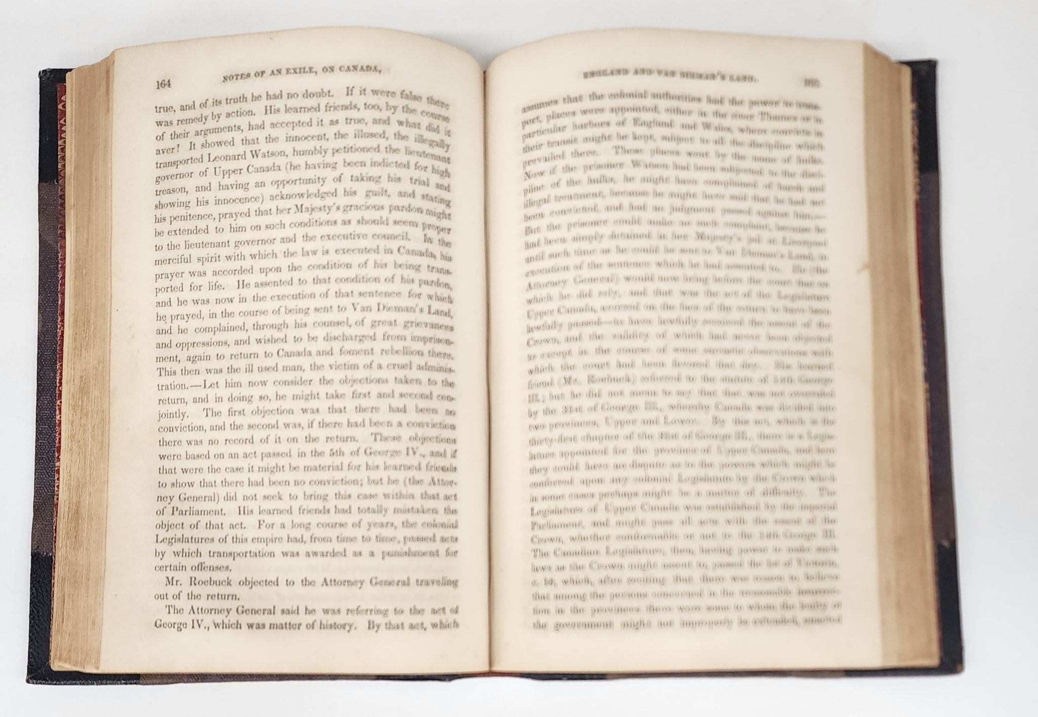 Title continues: "Comprising Incidents of the Canadian Rebellion in 1838, Trial of the Author in Canada, and Subsequent Appearance Before Her Majesty's Court of Queen's Bench, in London, Imprisonment in England, and Transportation to Van Dieman's Land. Also, An Account of the Horrible Sufferings Endured by Ninety Political Prisoners During a Residence of Six Years in That Land of British Slavery, Together With Sketches of the Island, Its History, Productions, Inhabitants, &c. &c." Linus W. Miller, a 22-year-old American lawyer, was transported to Van Dieman's Land as a state prisoner after becoming involved in the 1837 Canadian rebellion. He arrived on the Canton in Hobart Town in 1840 but returned to the US after his pardon and wrote this book. Provides an in-person account of the convict system in Australia and Tasmania. He was one of nine political exiles who published accounts of their experiences. Title page states "Slaves can breathe in England." Dedicated To William H. Seward. TPL 2790. Howes M613. Sabin 49037. Ferguson 4349. Cohen 4305.