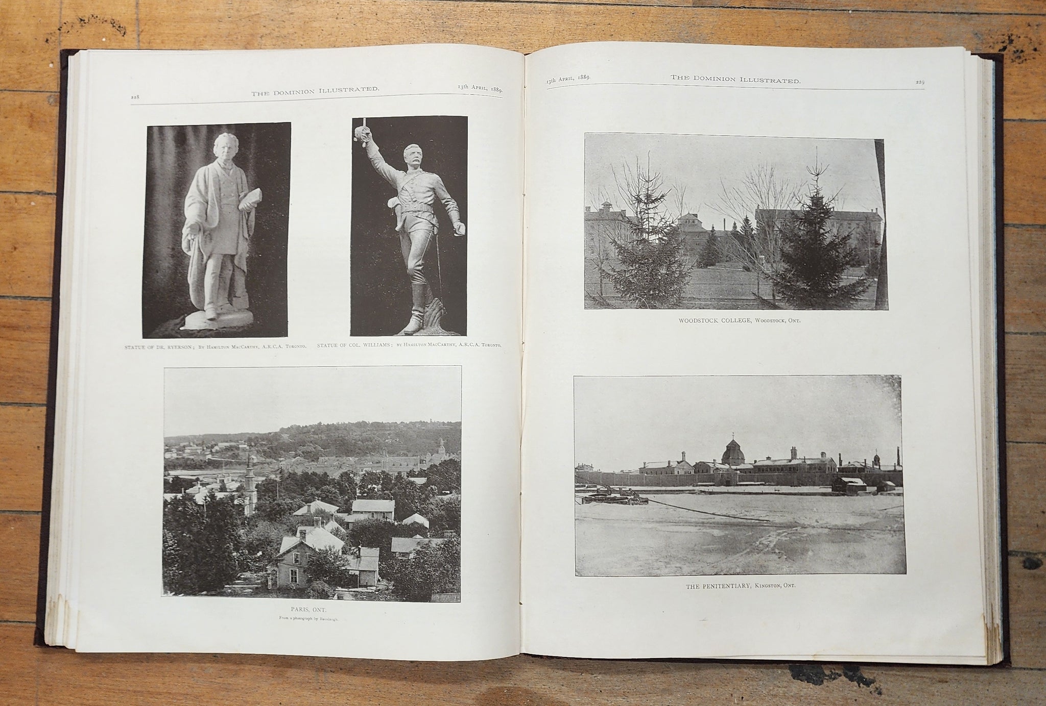 The world in 1888-89. Photos of Rideau Hall, Sir John A. Macdonald, Winnipeg City Hall, Banff Hotel, Niagara whirlpool, Parliament buildings at Ottawa, Canada Southern Railway Bridge in St. Thomas, London, Ontario Lunatic Asylum, much more Canadian scenery. Engravings of the Eiffel Tower (just completed), Paris Exhibition central dome, Industrial Hall, "new remedy for spinal diseases" etc. Also articles and poetry as well as humour.