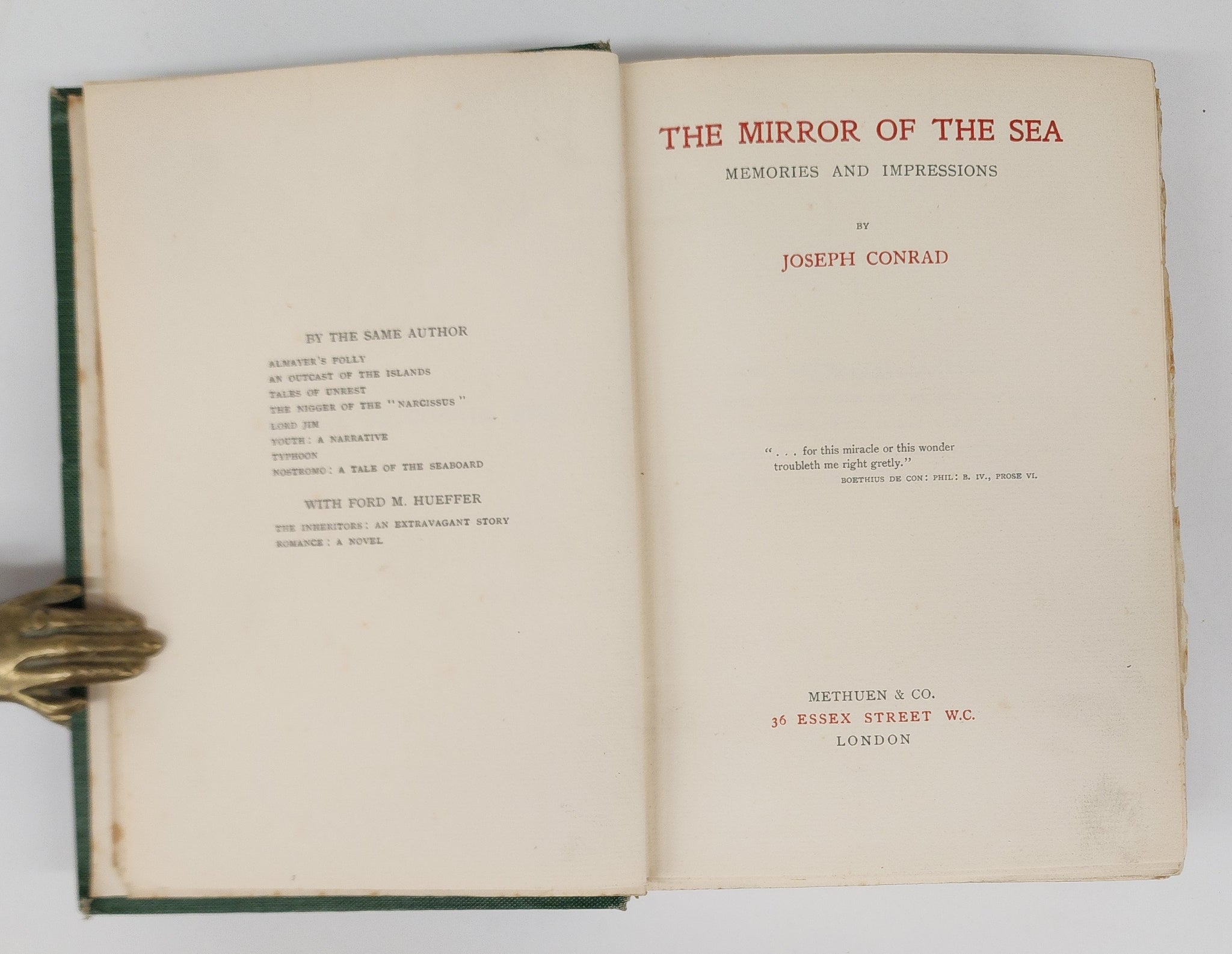 A collection of autobiographical essays by Conrad originally published as magazine articles. Running them all together into one book was a shrewd was of getting around the perceived unmarketability of short stories. Each chapter reflects some aspect of his experiences at sea, including the ocean's moods, how men deal with oceangoing life, the personalities of sailors, and the dangers they face. Although this book was a popular success, Conrad himself didn't think much of it, calling it "that sort of bosh" in a letter to H. G. Wells. 40 p. of publisher's ads at rear dated August 1906. Cagle A11a, binding a. Keating 67. Wise 16. Smith 12.
