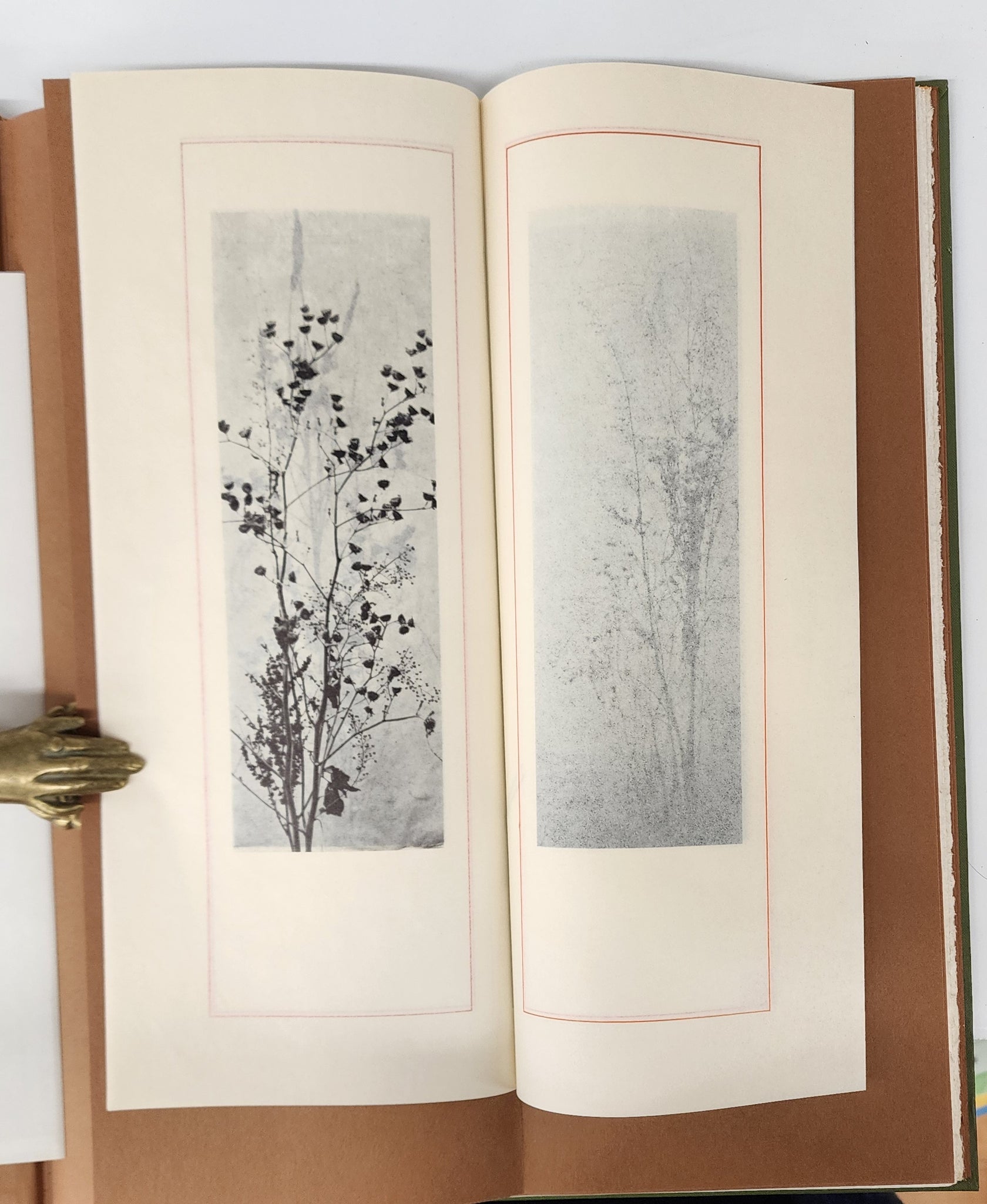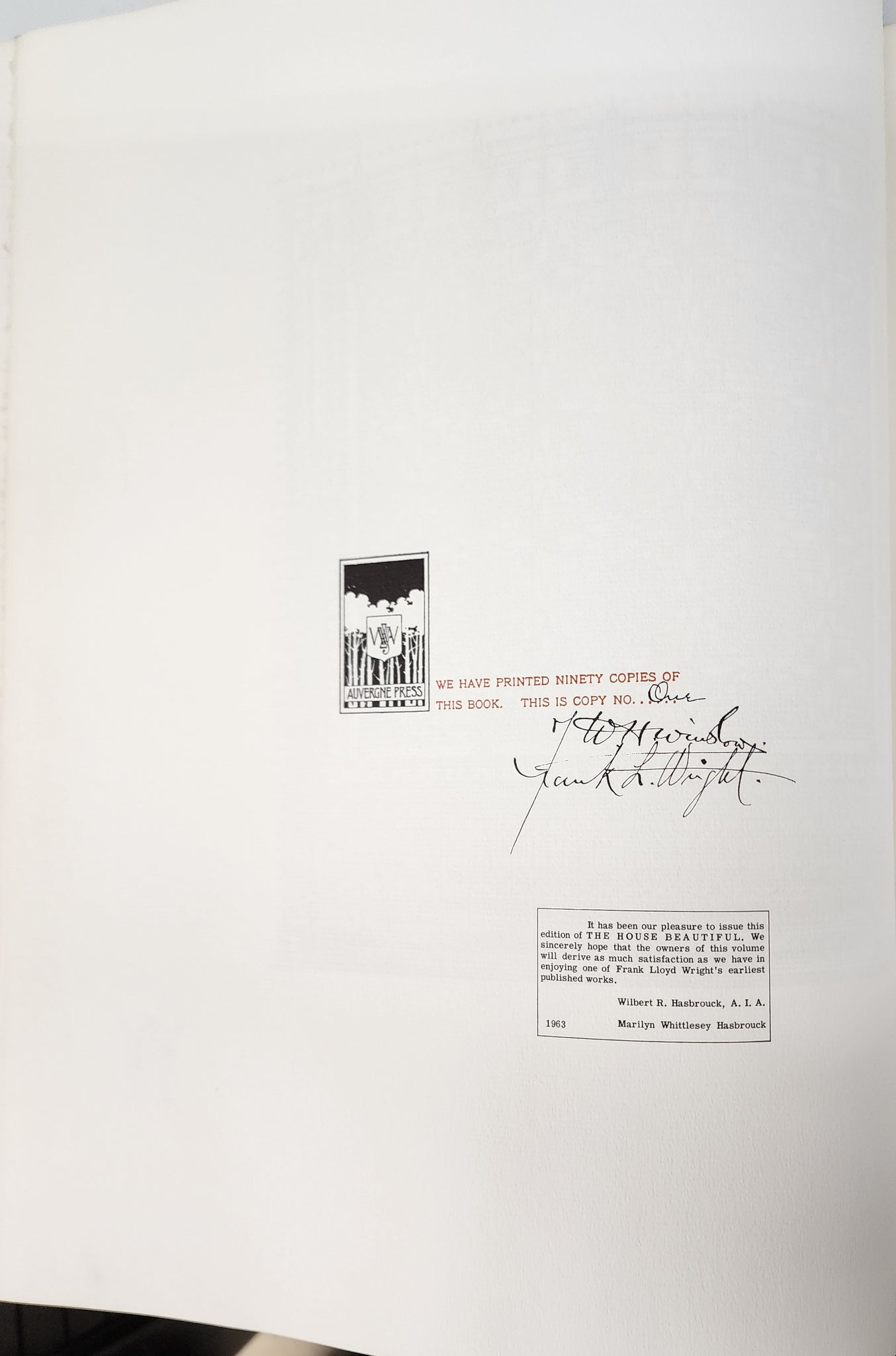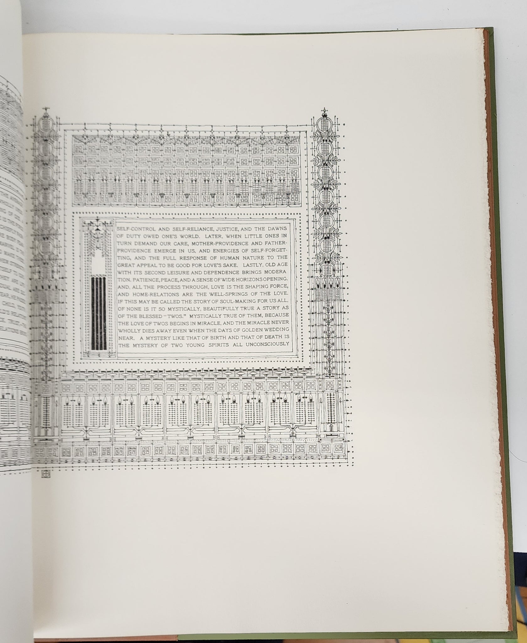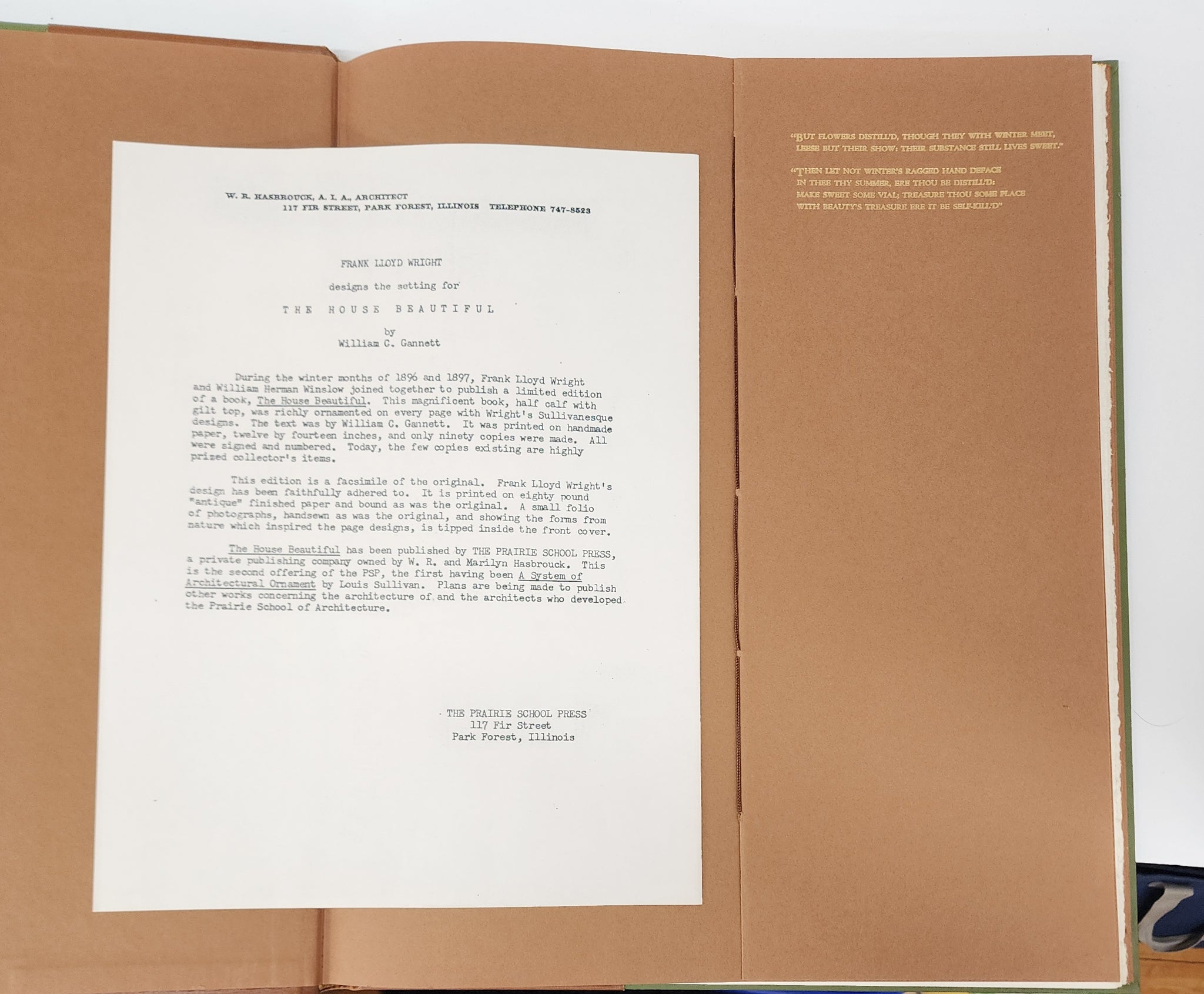 In the winter of 1896-7 Frank Lloyd Wright and William Herman Winslow joined together to publish a limited edition of William C. Gannet's The House Beautiful. Wright had heard the essay in a sermon and was inspired and charmed by the text about the importance of simplicity and craftsmanship in the home. In their publication, Gannet's text was framed with Wright's intricate tapestry-like decorations, inspired by ironwork and Middle Eastern tapestries. This facsimile was published by W. R. and Marilyn Hasbrouck of Prairie School Press.