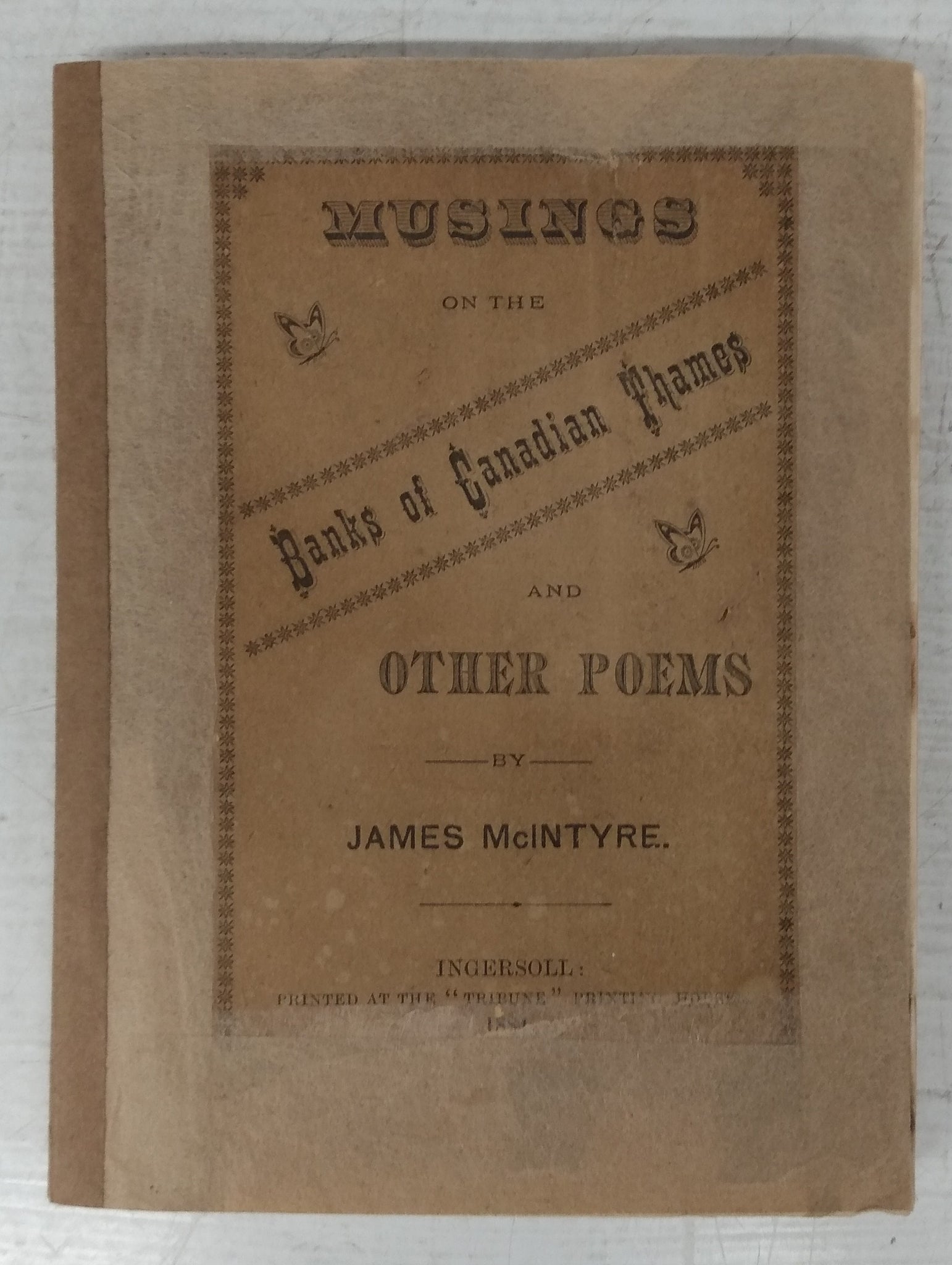 Title continues: "Including Poems on Local, Canadian and British Subjects, and Lines on the Great Poets of England, Ireland, Scotland and America, with a Glance at the Wars in Victoria's Reign." James McIntryre was an Ingersoll, Ontario poet widely renowned for his cheese poetry, as in "The Cheese Pioneer" (p. 70) and Oxford Cheese Maker's Song (p. 108). His main theme, however, was southwestern Ontario, with verse on such subjects as: "Disaster to Steamer Victoria at London" (p. 12), "Port Stanley" (p. 23), "London Flood" (p. 27), and the never- to-be-forgotten "Potato Bug Exterminator" on p. 82: "Now for a minute, lend your luggs,/ Our theme, it is potato bugs." An awesome addition to any Canadiana or Can Lit collection, especially for those with a twisted sense of humour. Note this copy was given to scientist Keewatin Dewdney by his parents, Irene and Selwyn Dewdney, pioneer Canadian art therapists.