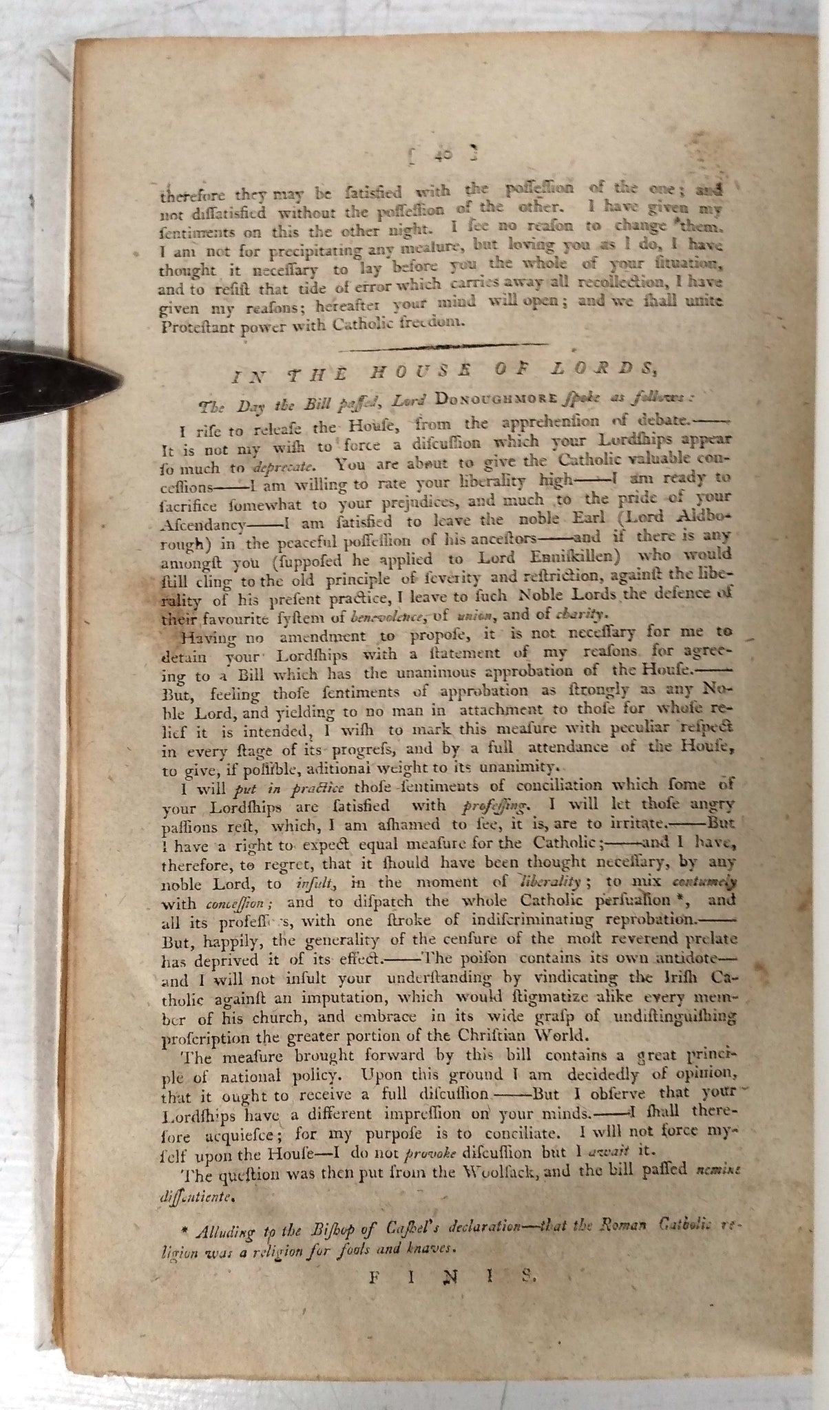 Title continues "Containing the Sentiments of the Most Able Senators as to the Propriety and Necessity of Admitting the Roman Catholic to the Full Participation and Rights of the Subject."