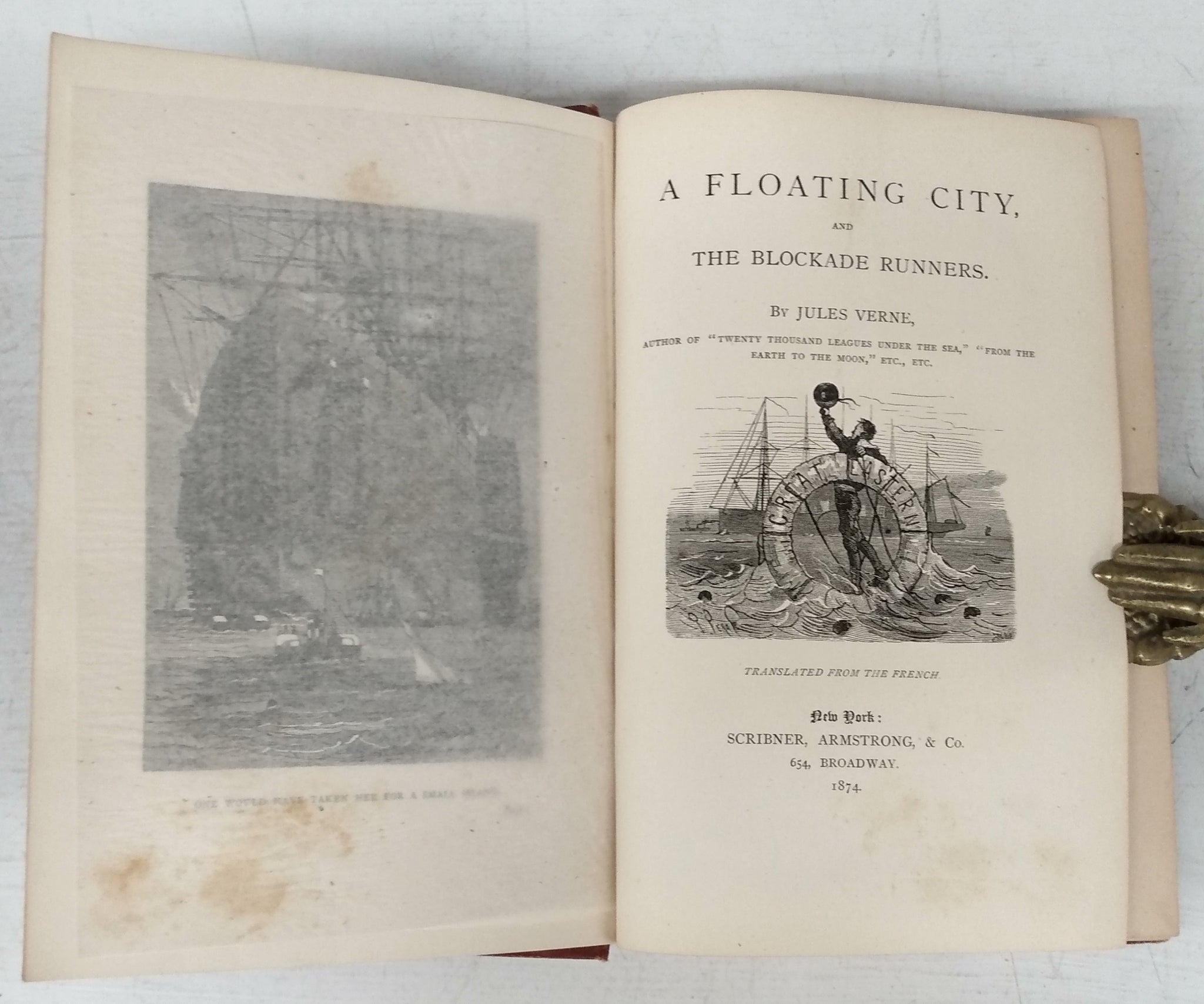 Two books in one volume. "Jules Verne's Works. The Authorized Editions" inserted after title page. "A Floating City" was based on Verne's own experiences on an 1867 transatlantic voyage on the Great Eastern, the largest iron ship ever built. The second novel is a romance taking place during the American Civil War. 8 p. of publisher's ads at rear. Myers 22. Taves & Michaluk V0008.