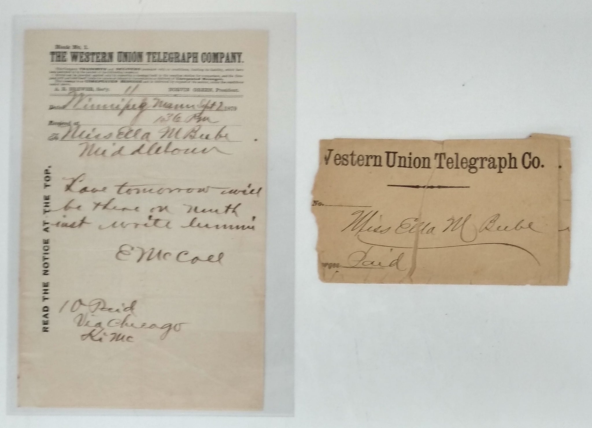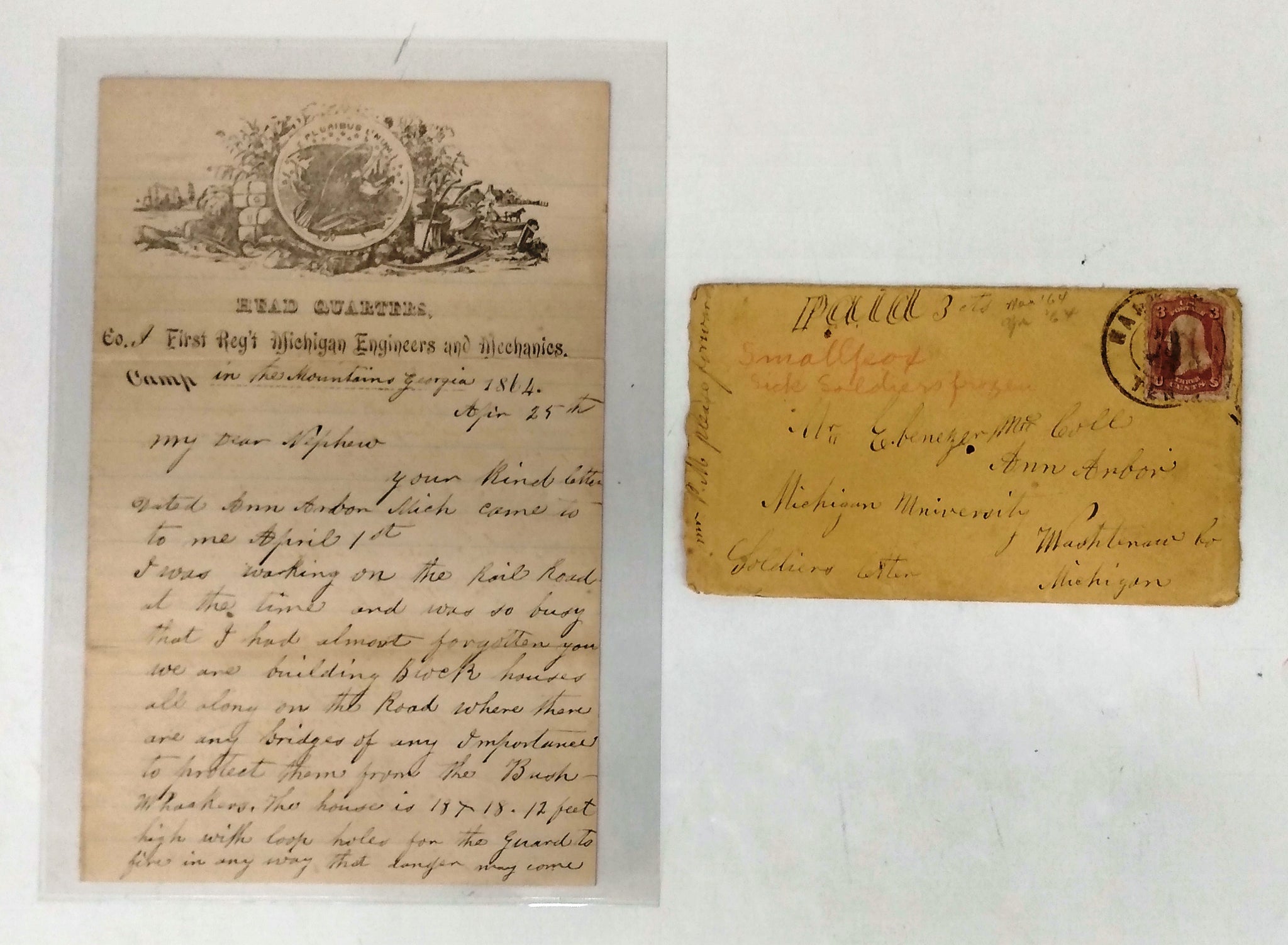 Three letters. 1) Stationery stating Head Quarters, Co. "I" (in ms.) First Reg. Mich. Engineers & Mechanics, dated at Elk River Bridge October 13, 1863 2) in the Mountains Georgia, April 25, 1864 3) At the foot of Rackoon Mountain Geor., May 30, 1864. Envelopes for each letter. Letters 20 cm. With 2 Western Union Telegrams (envelopes present)) sent by Ebenezer to his fiancée, Ella M. Beebe, dated Sept. 2 1879 at Winnipeg, and Sept. 6, 1879 in St. Thomas, Ont., three days before their wedding in Middletown, NY. Some short tears along folds of letters and one envelope in two sections. Housed in 27 cm album for safekeeping.