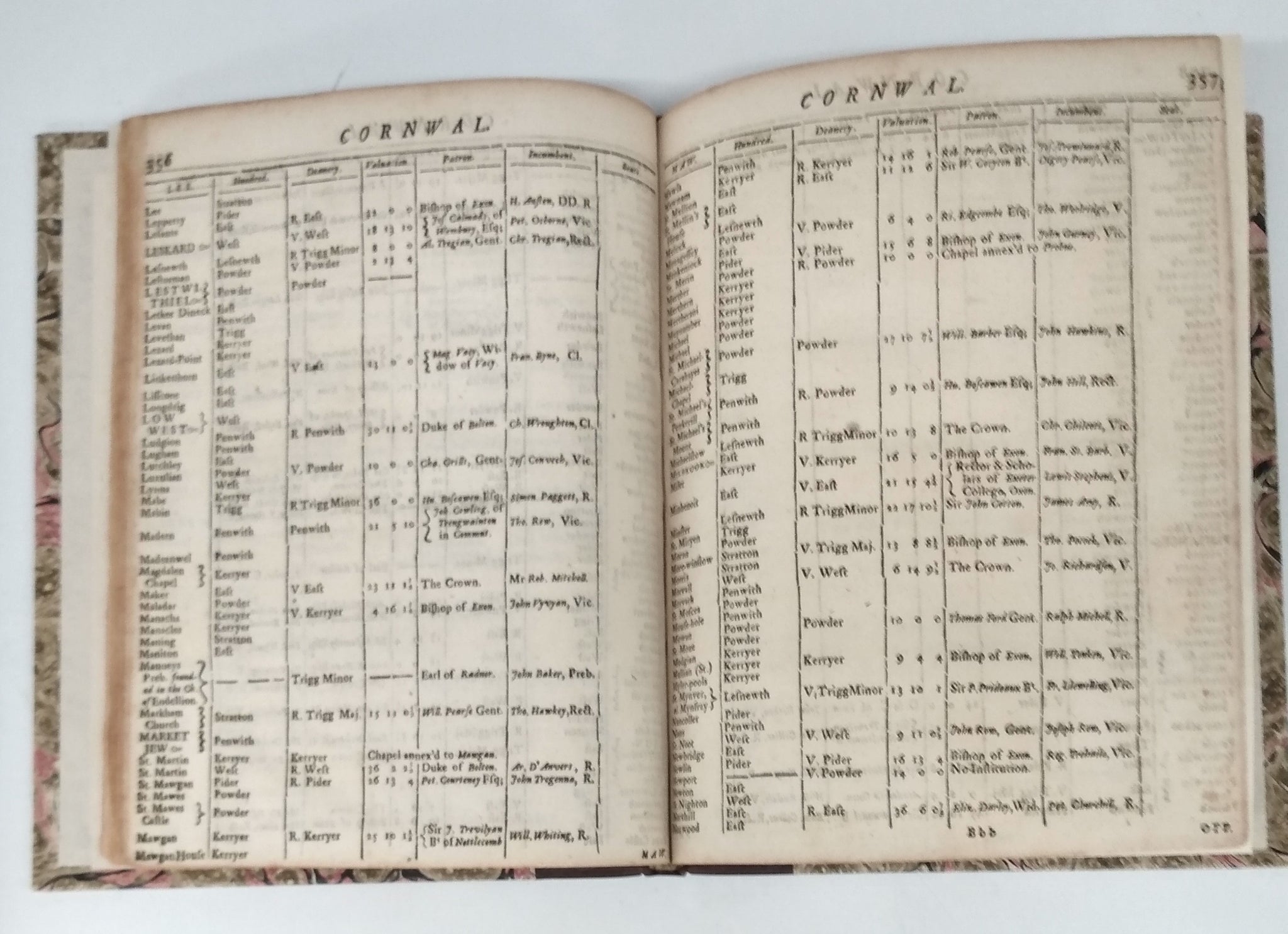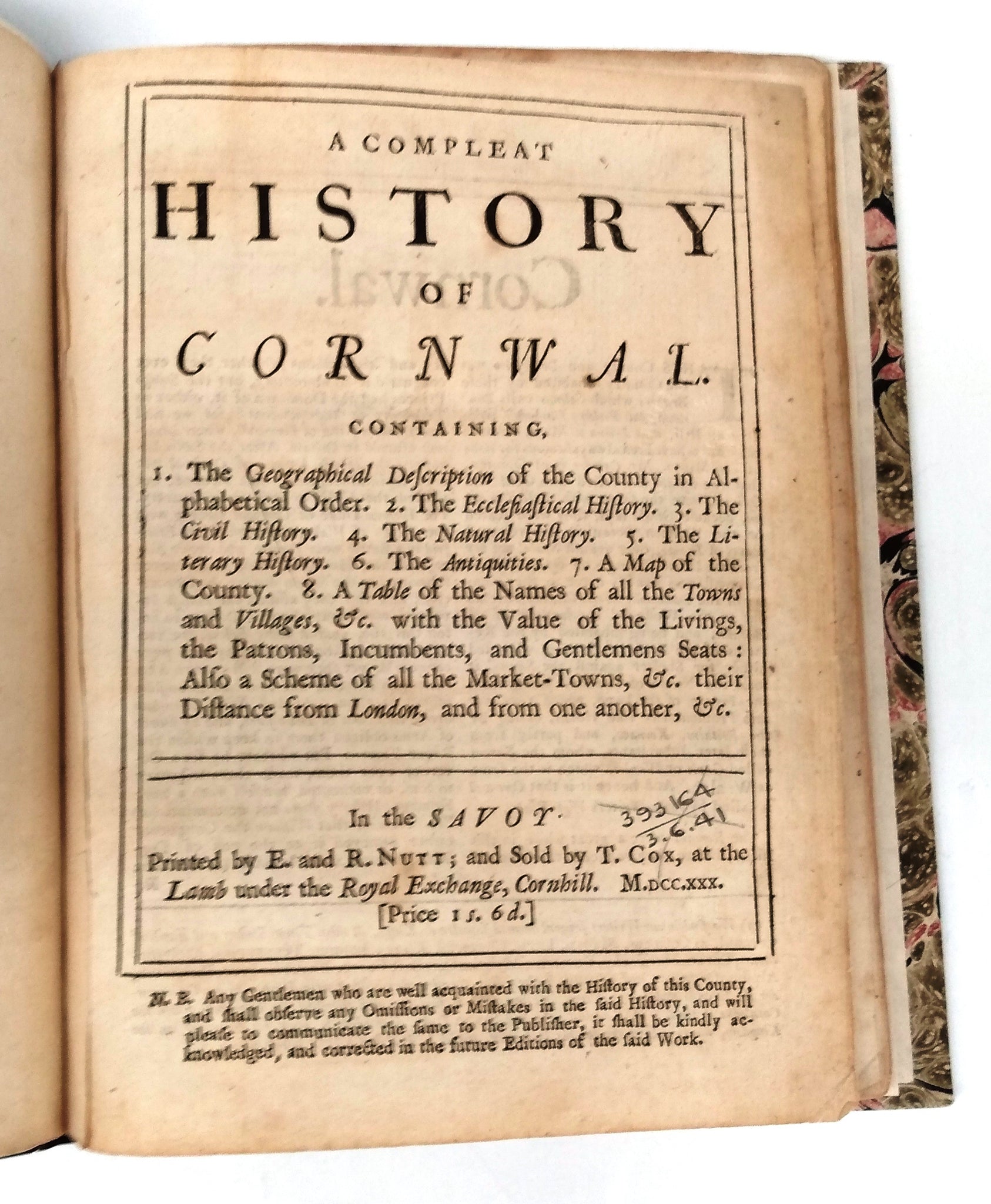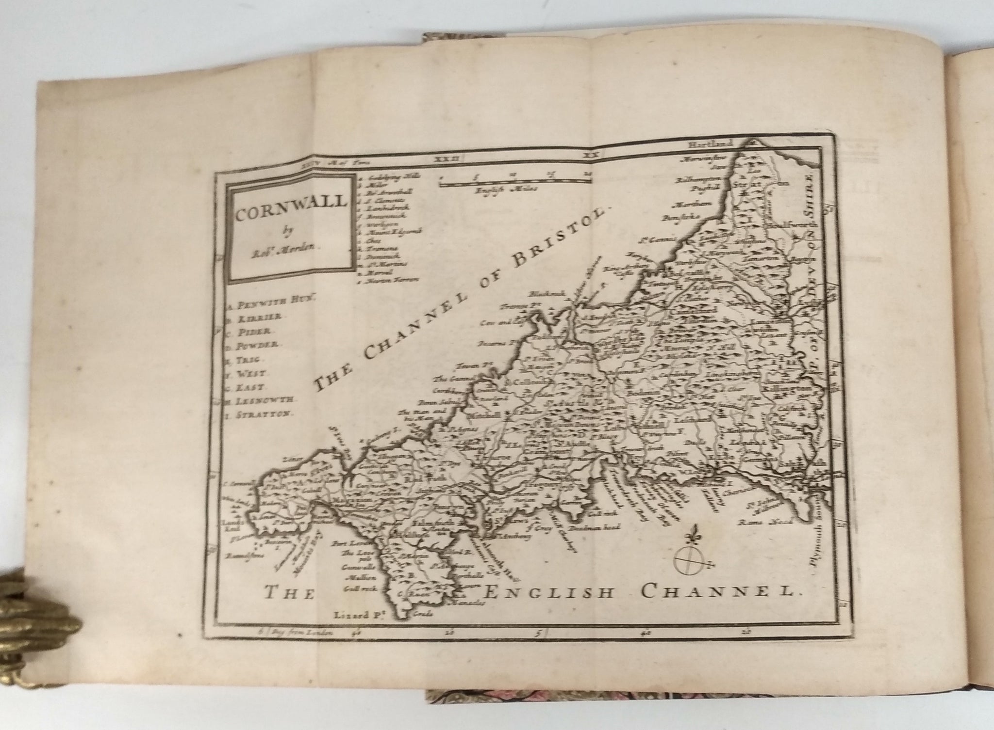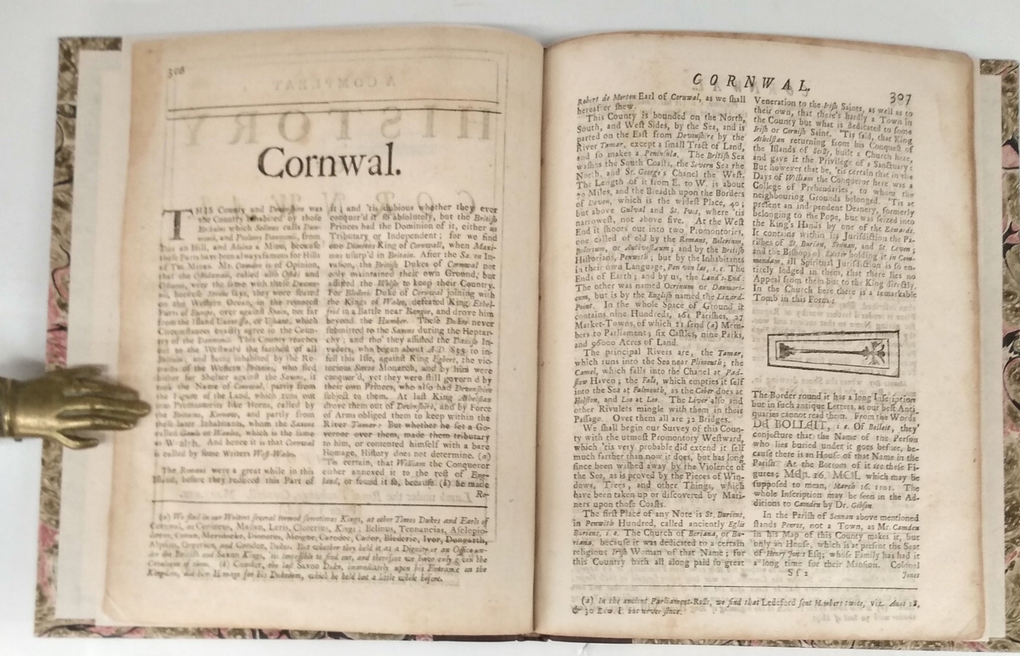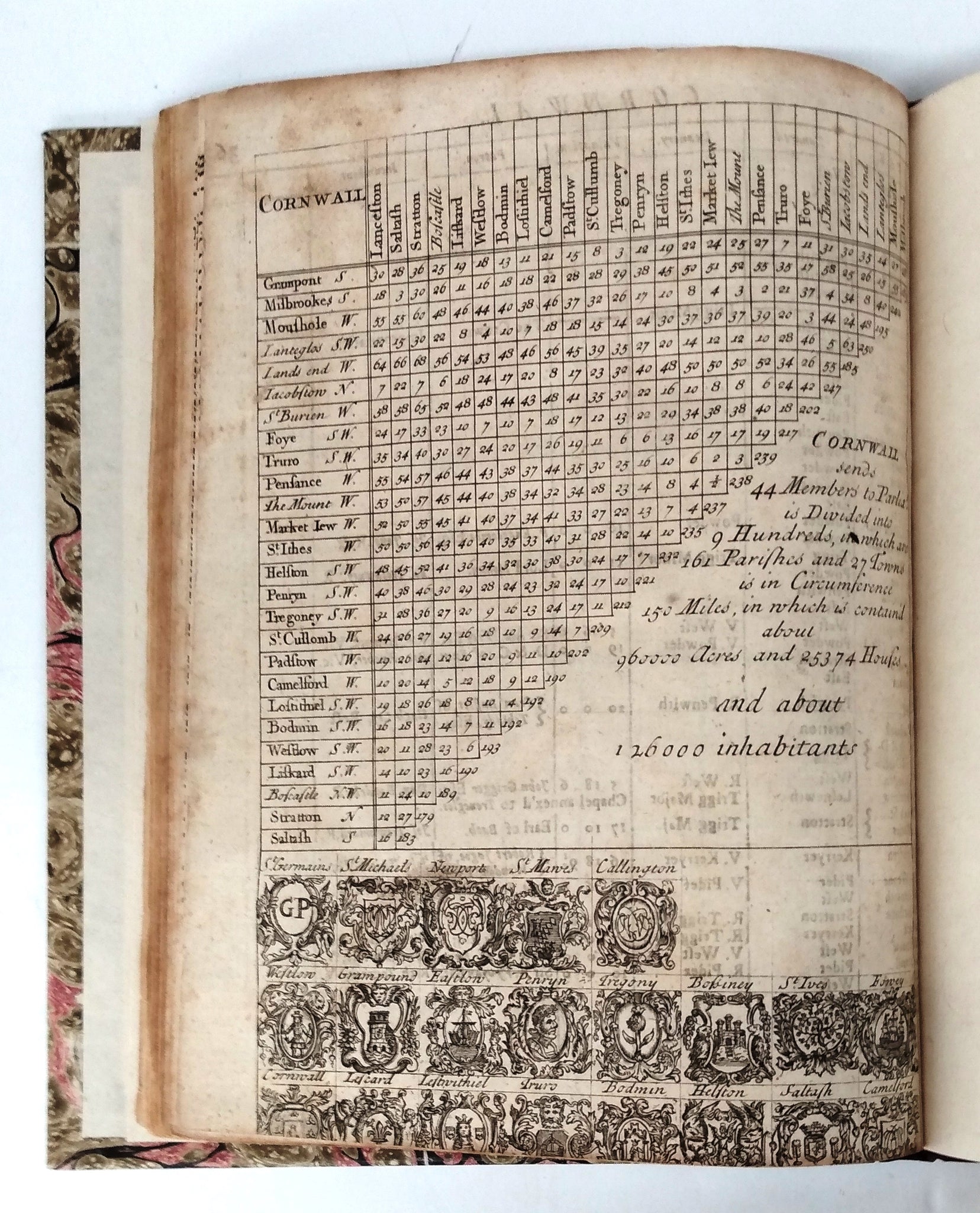 Title continues: "Containing, I. The Geographical Description of the County in Alphabetical Order. 2. The Ecclesiastical History. 3. The Civil History. 4. The Natural History. 5. The Literary History. 6. The Antiquities. 7. A Map of the County. 8. A Table of the Names of all the Towns and Villages, &c. with the Value of the Livings, the Patrons, Incumbents, and Gentlemens Seats: Also a Scheme of all the Market-Towns, &c. their Distance from London, and from one another, &c." This book appears to be one section of "Magna Britannia et Hibernia, antiqua & nova. Or, a new survey of Great Britain" of which one of the authors was Thomas Cox and Robert Morden was cartographer. Some of the individual counties were re-issued separately with a new title page in 1730, retaining the original pagination. Each county chapter had a folding engraved map by Morden and an engraved table of distances at rear, in this case on the verso of the final text-page. Here T. Cox is named as bookseller on the title page but a Thomas Cox is known to have been one of the authors of "Magna Britannia," along with Anthony Hall and John Sturt.